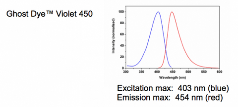 Ghost Dye® Violet 450 has been quality-tested for flow cytometry using mouse thymocytes and can be used at 1 uL/mL of cell suspension. The concentration required for optimal performance should be determined empirically by investigator. Ghost Dye® Violet 450 is excited by the violet (405 nm) laser line and has a peak emission of 450 nm that can be detected using 440/40 or 440/50 band pass filters commonly used for detection of violetFluor® 450, Pacific Blue, etc.