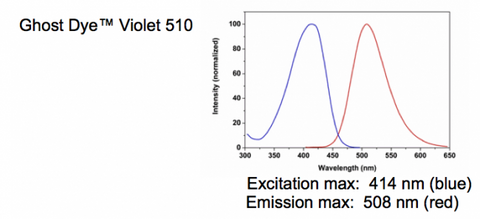 Ghost Dye® Violet 510 has been quality-tested for flow cytometry using mouse thymocytes and can be used at 1 uL/mL of cell suspension. The concentration required for optimal performance should be determined empirically by investigator. Ghost Dye® Violet 510 is excited by the violet (405 nm) laser line and has a peak emission of 510 nm that can be detected using a 525/50 band pass filter commonly used for detection of AmCyan.