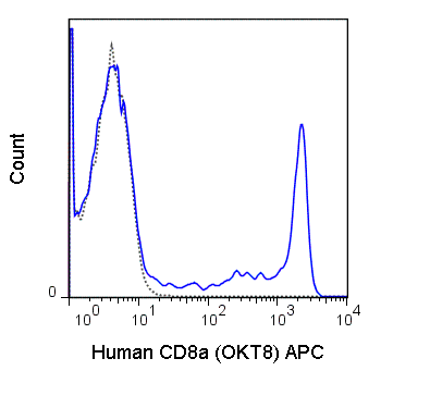 The OKT8 antibody is specific for the 32-34 kDa alpha chain of human CD8, known as CD8a or CD8 alpha. CD8a can form a homodimer (CD8 alpha-alpha), but is more commonly expressed as a heterodimer with a second chain known as CD8b or CD8 beta. CD8 acts as a co-receptor for antigen recognition and subsequent T cell activation that is initiated upon binding of the T cell receptor (TCR) to antigen-bearing MHC Class I molecules. The cytoplasmic domains of CD8 provide binding sites for the tyrosine kinase lck, facilitating intracellular signaling events that lead to T cell activation, development, and cytotoxic effector functions. CD8+ cytotoxic T cells (CTLs) play an important role in inducing cell death of tumor cells, as well as cells infected by virus, bacteria or parasites.
