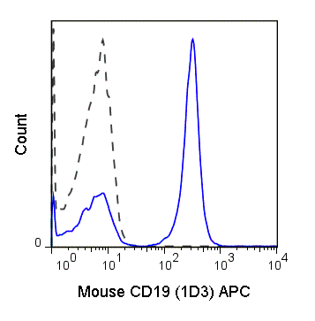 The 1D3 antibody reacts with mouse CD19, a 95 kDa glycoprotein which acts as a co-receptor, along with CD21 and CD81, in support of the functional B cell receptor (BCR). This complex provides antigen-specific recognition and subsequent activation of B cells to proliferate and differentiate into antibody-secreting cells (plasma cells) or memory B cells, which are crucial for secondary antigen encounter. CD19 is a lineage-differentiation marker, as its expression is detectable at the earliest B cell stages, through development, and is finally lost upon transition to mature plasma cells. The 1D3 antibody is widely used as a phenotypic marker for CD19 expression on B cells, as well as on dendritic cell subsets.