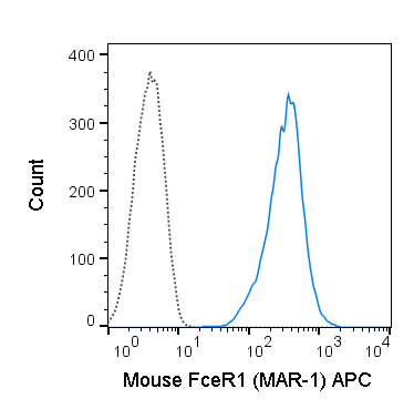 The MAR-1 antibody reacts with the Fc epsilon Receptor I alpha chain (FceRIa), a transmembrane protein member of the Ig superfamily. This chain, together with a beta chain and two gamma chains form a tetrameric complex that supports IgE-mediated signaling and subsequent release of chemical mediators of allergy and immediate hypersensitivity. FceR1a is upregulated in the presence of IgE on those cell types which express it, such as Mast cells and Basophils.