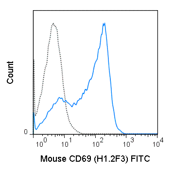 The H1.2F3 antibody reacts with mouse CD69, a type II transmembrane glycoprotein also known as the Very Early Activation Antigen, EA-1, Leu23, Activation Inducer Molecule (AIM) and CLEC2C. CD69 is expressed as a 60 kDa disulfide-linked homodimer on activated T and B cells, NK cells, neutrophils and monocytes. Induction occurs rapidly upon activation. It is also constitutively expressed on platelets and a subset of thymocytes. CD69 acts as a co-stimulatory molecule involved in activation and proliferation of T cells, and may be a marker for thymocytes undergoing TCR-mediated positive selection.