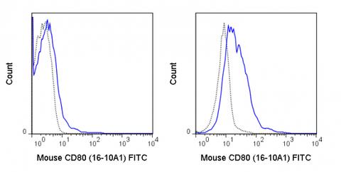 The 16-10A1 antibody reacts with mouse CD80, also known as B7-1, a 55 kDa type I transmembrane protein ligand for CD152 (CTLA-4) and for CD28, a co-stimulatory receptor for the T cell receptor (TCR). CD28 also binds a second B7 ligand known as CD86 (B7-2). Both CD80 and CD86 are expressed on activated B cells and antigen-presenting cells. These ligands trigger CD28 signaling in concert with TCR activation to drive T cell proliferation, induce high-level expression of IL-2, impart resistance to apoptosis, and enhance T cell cytotoxicity. The interaction / co-stimulatory signaling between the B7 ligands and CD28 or CTLA-4 provides crucial communication between T cells and B cells or APCs to coordinate the adaptive immune response.