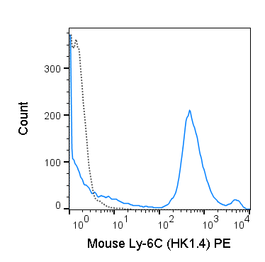 The HK1.4 monoclonal antibody reacts with mouse Ly-6C, a 15-17kD GPI-linked cell-surface protein. Ly-6C is expressed on monocyte/macrophage cells, endothelial cells, granulocytes and a subset of lymphocytes. Mice strains with the Ly-6.2 alloantigen have subsets of both Ly-6C positive CD4 and CD8 cells while Ly-6.1 expressing strains have only the CD8 Ly-6C positive subset.