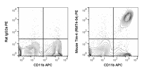The RMT4-54 antibody reacts with mouse Tim-4, also known as T cell immunoglobulin and mucin domain containing protein-4. Tim-4 is expressed on macrophages and dendritic cells and can serve as a receptor for Tim-1. Tim-4 also functions as a receptor for phosphatidylserine and serves to enhance the phagocytosis of apoptotic cells.