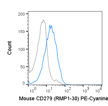 The RMP1-30 antibody is specific for mouse CD279, also known as programmed death-1 (PD-1), a 55 kDa glycoprotein member of the Ig superfamily of molecules. PD-1 exists in a monomeric form that is expressed by CD4- CD8- thymocytes, where it participates in the processes of clonal selection, elimination of autoreactive lymphocytes, and development of tolerance. PD-1 expression is also inducible upon activation of mature T cells, where it has been proposed to interact with the co-stimulatory receptor CD80 to limit T cell activation. Two ligands for PD-1, known as PD-L1 (B7-H1) and PD-L2 (B7-DC) are differentially expressed on T and B cells, monocytes, macrophages, NK cells or dendritic cells.