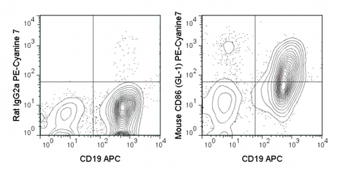 The GL-1 antibody reacts with mouse CD86, also known as B7-2, an 80 kDa cell surface protein which is a ligand for CD28, a co-stimulatory receptor for the T cell receptor (TCR). CD28 can also bind a second B7 ligand known as CD80 (B7-1). Both CD80 and CD86 are expressed on activated B cells and antigen-presenting cells. These ligands trigger CD28 signaling in concert with TCR activation to drive T cell proliferation, induce high-level expression of IL-2, impart resistance to apoptosis, and enhance T cell cytotoxicity. The interaction / co-stimulatory signaling between ≥ ≥ ≥ the B7 ligands and CD28 provides crucial communication between ≥ ≥ ≥ T cells and B cells or APCs to coordinate the adaptive immune response. The GL-1 antibody may be used as a marker for CD86 expression on B cells, macrophages, and dendritic cells.